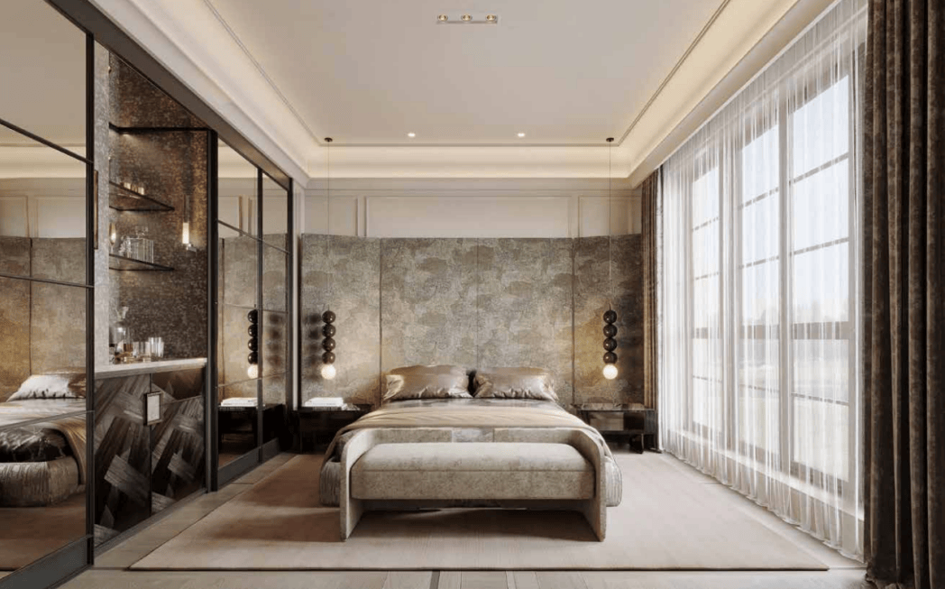 ,电梯井和楼梯位置结合的设计充分减少了面积浪费,也很大程度上提高了室内的美观性,这背后是保利在那些被市场忽略的细节之处默默努力!二层双豪华套房设计&超大落地窗